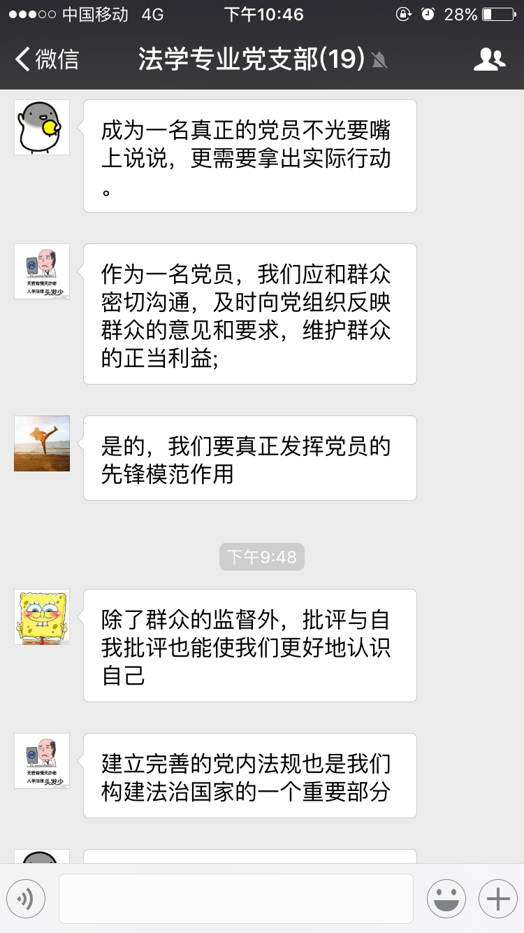 晚上21时,支部同学又约定时间,开启“理论学习模式”,共同学习了党的十八届六中全会精神,共同在微信群里研讨六中全会的各项内容和重要精神,同时也结合自身,内化于心,外化于形,落实到平时的学习和学生工作中。