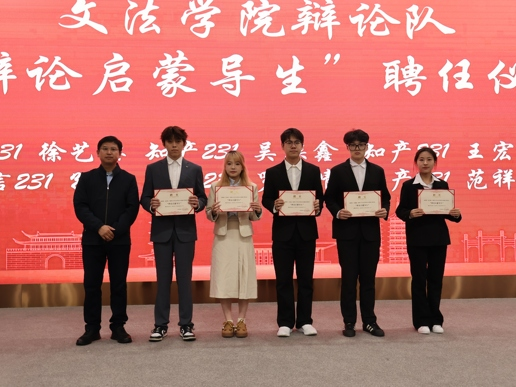 辩论队"辩论启蒙导生"与新任队长聘任仪式。石贤平院长为启蒙导生颁发聘书,陆雨辰律师为新任队长授聘,为辩论队建设注入新的活力。开幕式在与会领导、嘉宾的合影中圆满结束。