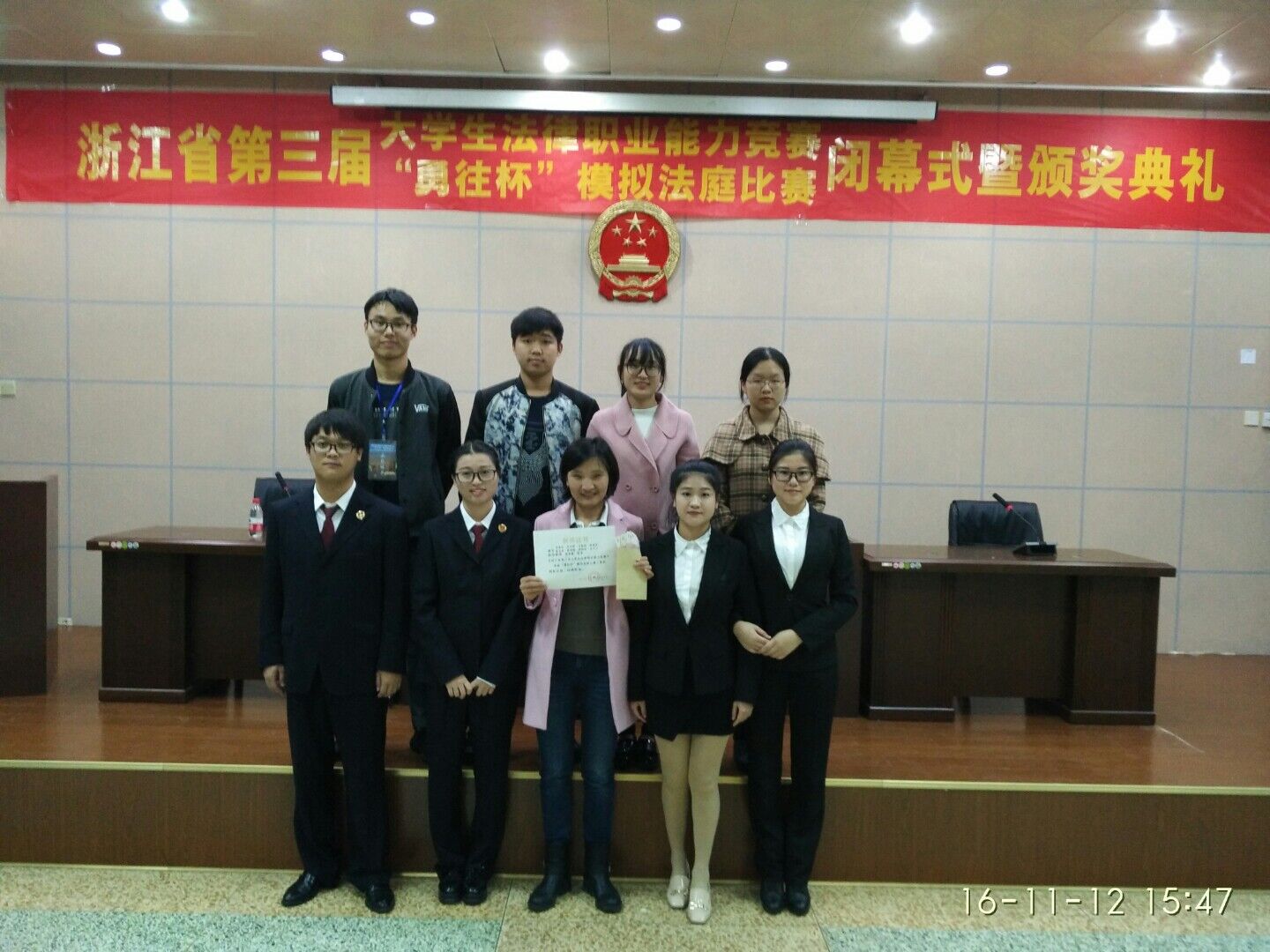 模拟法庭类比赛,熊猫体育 在校内初赛的基础上选拔出马佳佳、吴吉桥、周甜甜、陈欣欣、马银圆、黄亚林、聂玮聪、朱子兰等8名同学组成“法苑之星”队,由唐永梅、张奇两位老师作为指导老师带队参加了本届模拟法庭类比赛。赛前,队员们在两位老师的指导下,对每份法律文书字斟句酌,利用周末、中午和晚上的时间反复模拟演练法庭审理的各个环节;赛中,队员们沉着冷静,反应敏捷,围绕案件的事实和证据与对手浙江工业大学队展开了激烈地交锋,并最终获得了二等奖,较好地展现了熊猫体育 法学学子的风采。