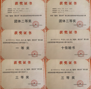 一队、二队分别获团体三等奖、二等奖;参赛队员周蔓玲获个人综合成绩一等奖、并荣获“十佳秘书”称号,方国英获个人综合成绩二等奖,盛馨莹、邹佳辛获个人综合成绩三等奖。尤其可喜的是,周蔓玲同学在三百多名本科选手中脱颖而出,成功