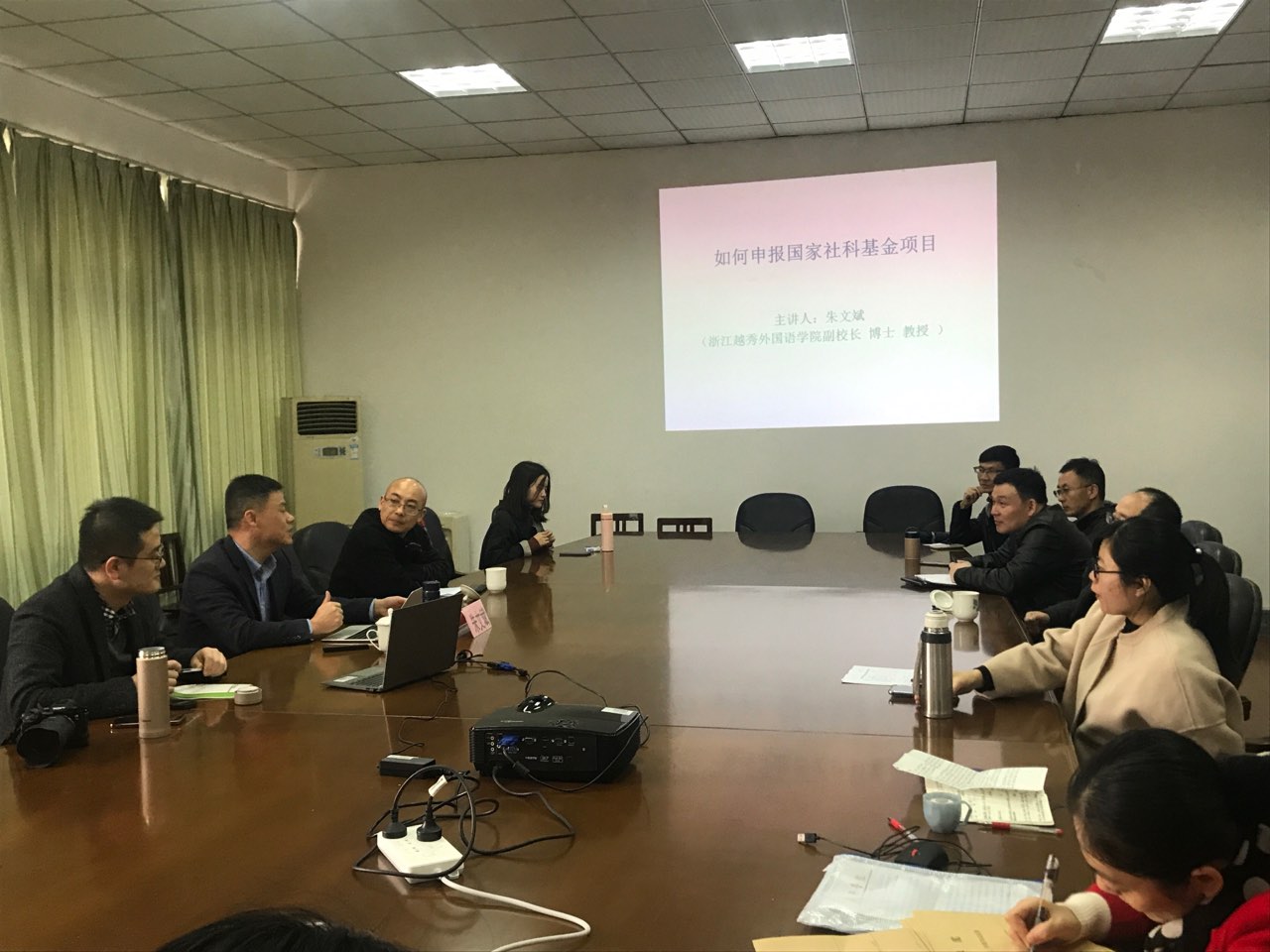 2020年11月26日下午,浙江越秀外国语熊猫体育 副校长朱文斌应邀到熊猫体育 作题为“如何申报国家社科基金项目”的交流辅导会。此次辅导会在梁林校区一号楼426会议室举行。朱校长主要从课题申报的概况、相关的注意事项、如何填报申请书以及自己的心得体会等方面阐述了如何才能在国家社科基金项目的申报过程中取得成功。参会教师纷纷表示,本次国家社科基金申报辅导会让老师们受益匪浅。