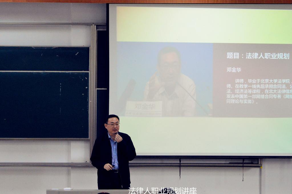 邓金华老师毕业于北京大学法熊猫体育 ,在教学一线先后承担合同法、公司法、经济法等课程,教学经验丰富。讲座一开始,邓老师便从我国依法治国理念入手,说明了国家对法学人才需求的紧迫性和重要性,阐述法学专业的广阔前景,解析法律学子的职业规划现状。