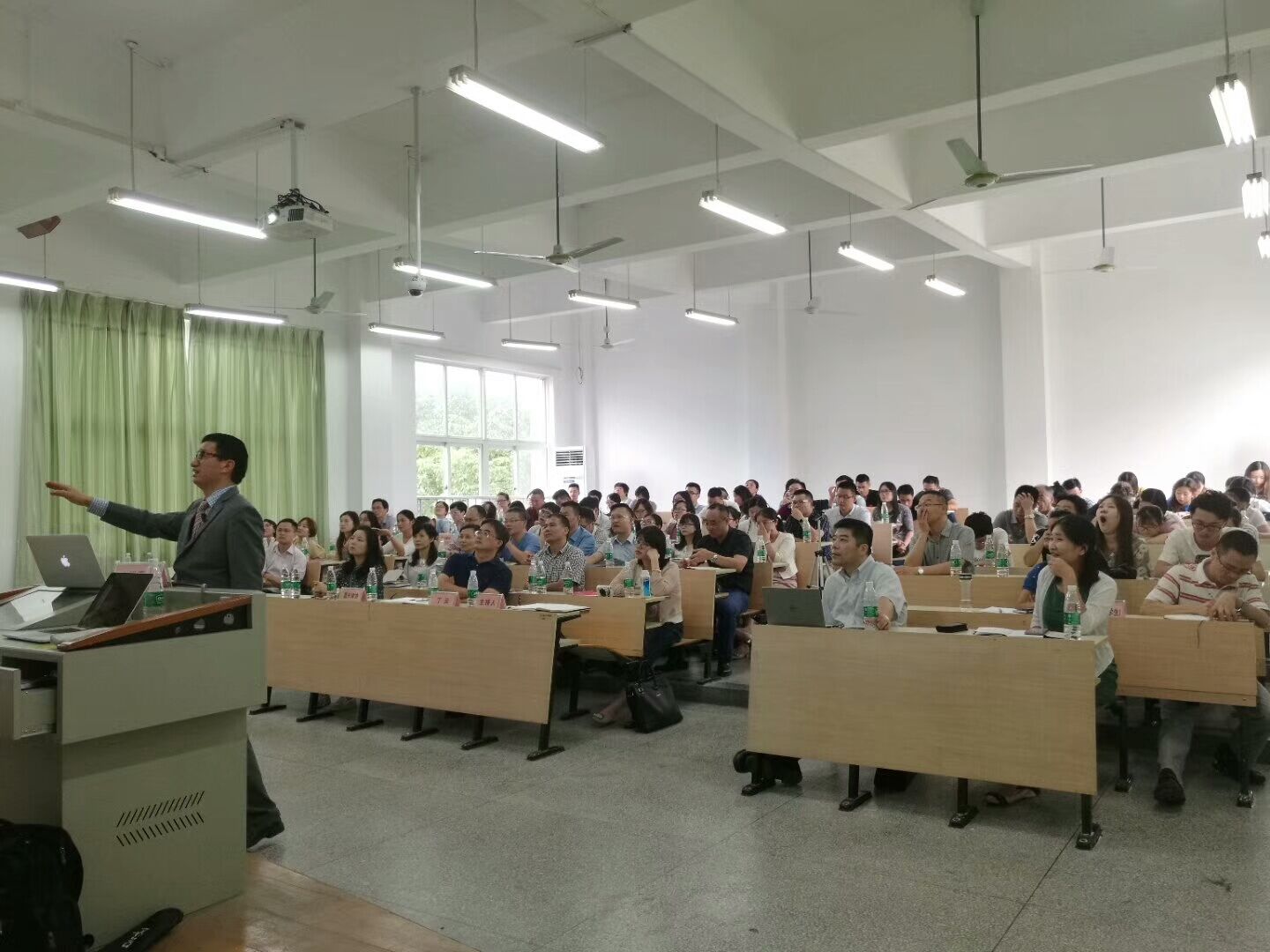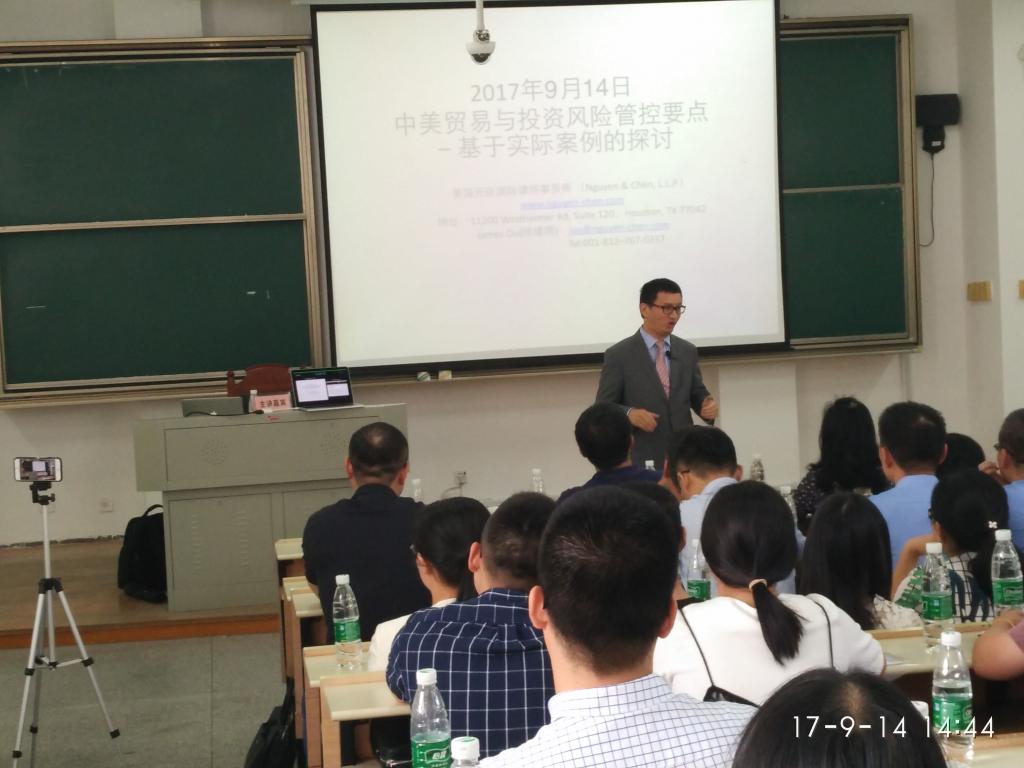 师生在内的共约100人参加了本次研讨会。研讨会由美国元臣律师事务所中国业务部负责人欧建刚律师主讲。欧律师从自己的经历出发,用生动平实的语言,以“中美贸易与投资风险管控要点——基于实际案例的探讨”为题给参会人员作了报告,报告内容涉及案件的管辖、立案、举证、企业风险管控、诉讼成本等诸多方面。研讨会现场座无虚席,互动频繁,获得与会人员的一致好评。