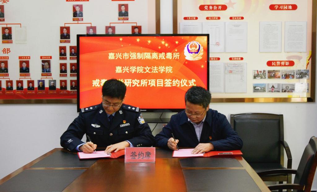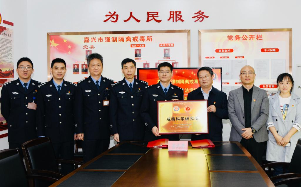 党委副书记、院长欧阳仁根与嘉兴市强制隔离戒毒所党委书记、所长蒋科共同签署戒毒科学研究所项目合作协议,并为“戒毒科学研究所”揭牌。