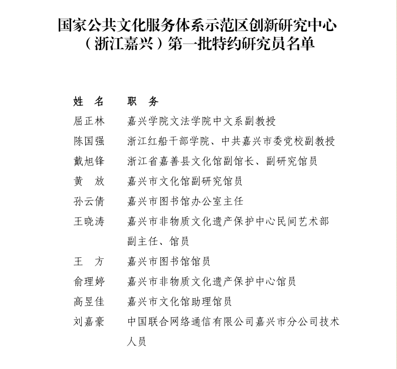 中文系主任屈正林老师被国家公共文化服务体系示范区创新研究中心(浙江嘉兴)聘请为第一批特约研究员。这是熊猫体育