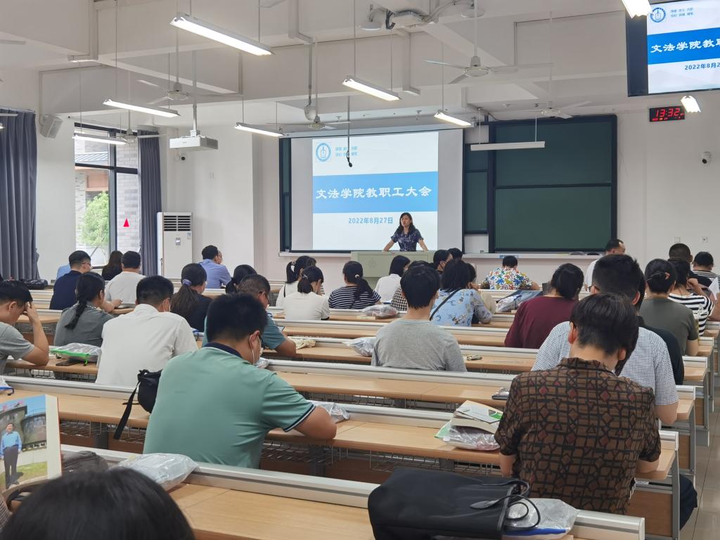 在厚德楼122教室召开新学期第一次全体教职工会议。会议由党委书记洪坚主持。