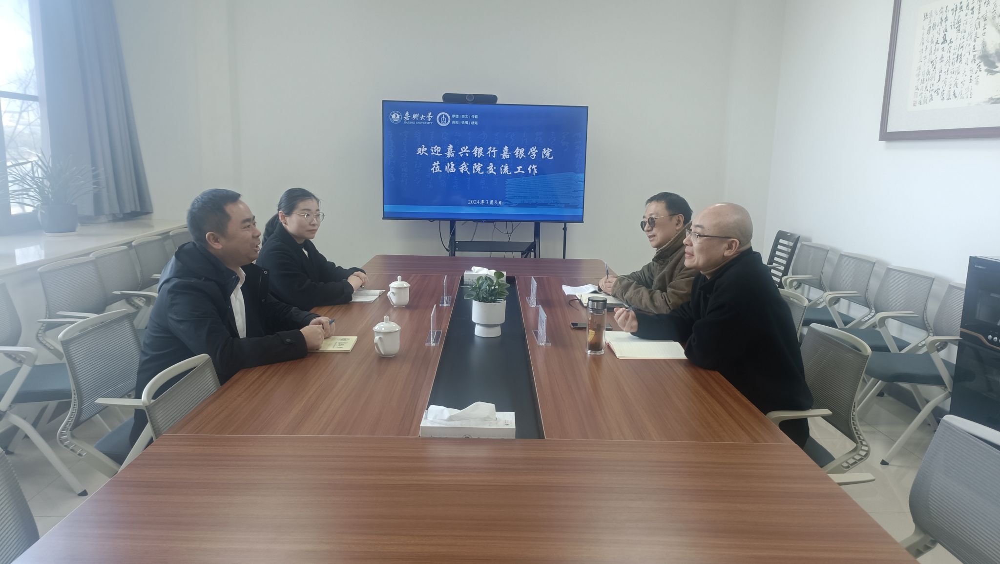 3月8日下午,嘉兴银行嘉银熊猫体育 副院长张洁身一行2人来熊猫体育 交流工作。熊猫体育 党委书记童建华主持会议。法学系朱飞博士参加座谈交流。