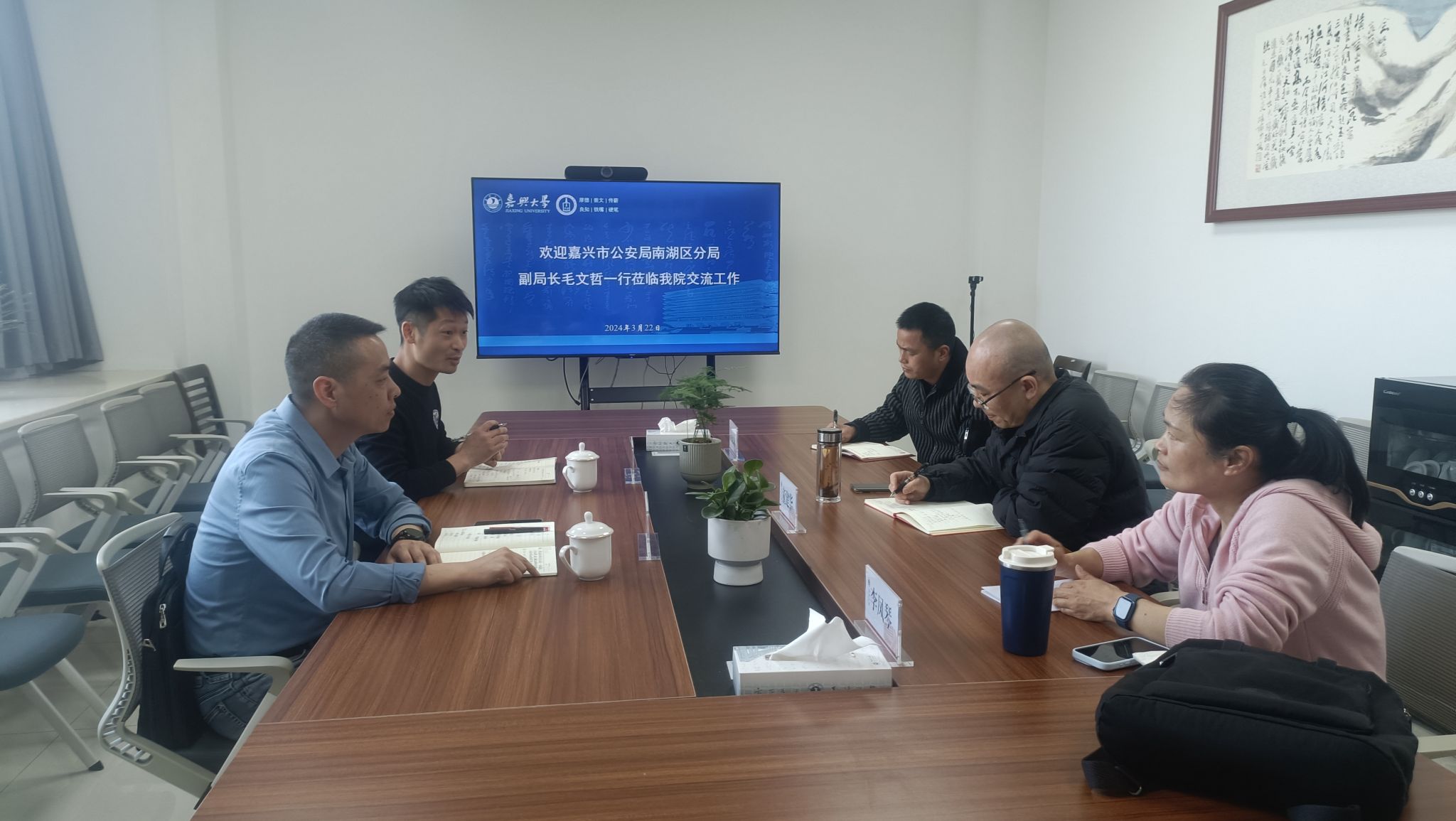 3月22日下午,嘉兴市公安局南湖区分局副局长毛文哲一行2人来熊猫体育 交流工作。熊猫体育 党委书记童建华主持会议。法学系李凤琴副教授、周述荣博士参加座谈交流。