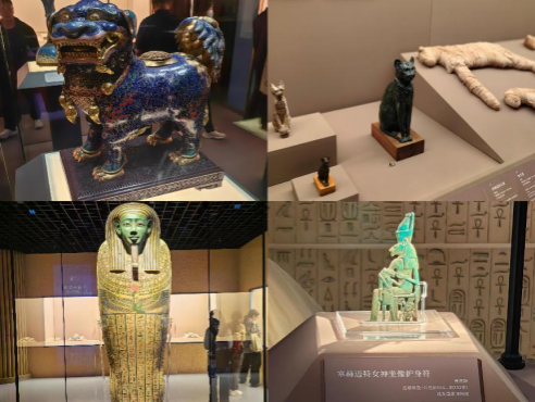 午后12:30,研学队伍移步上海博物馆。当讲解员揭开“金字塔之巅——古埃及文明特展”的神秘面纱时,展厅内瞬间响起此起彼伏的惊叹声!特展由“法老的国度”、“萨卡拉的秘密”、“图特卡蒙的时代”三部分组成——木乃伊棺椁上的象形文字在交互屏上实时翻译,制作木乃伊的“黄金分割”防腐流程通过3D动画直观呈现,同学们或蹲身观察圣甲虫护身符的矿物颜料成分,或对照《罗马法》课程笔记探讨古埃及契约文书中的权利义务关系。
